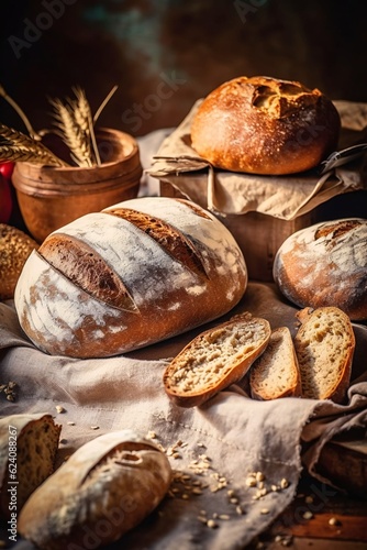 Composition with bread and bakery products on dark background. Bakery concept. Generative AI technology.