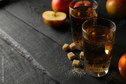 Composition with cider, sugar and apples on wooden background