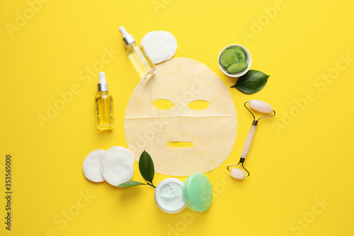 Composition with fabric facial mask, cosmetics and cucumber on color background
