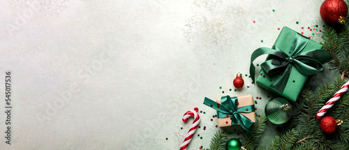 Composition with fir branches, Christmas gifts and decorations on light background with space for text