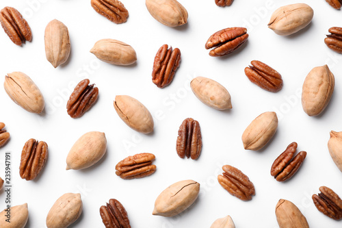 Composition with pecan nuts on white background, top view