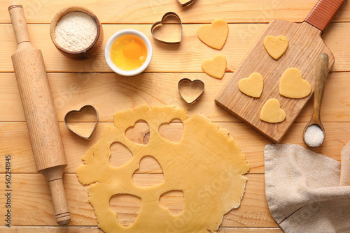 Composition with raw cookies, dough, ingredients and utensils on wooden background. Valentines Day celebration