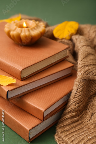 Composition with stack of books, sweater, candle and autumn leaves on green background