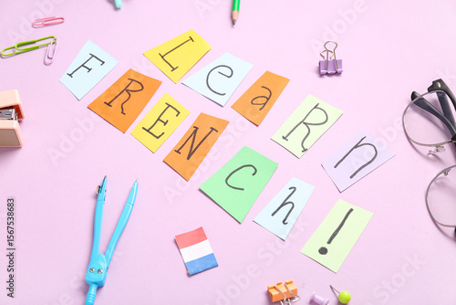 Composition with text LEARN FRENCH and different stationery on pink background
