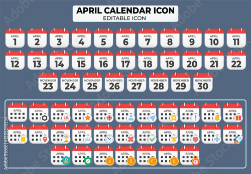 Comprehensive April Calendar Icon Set for Design and Scheduling Needs featuring editable elements
