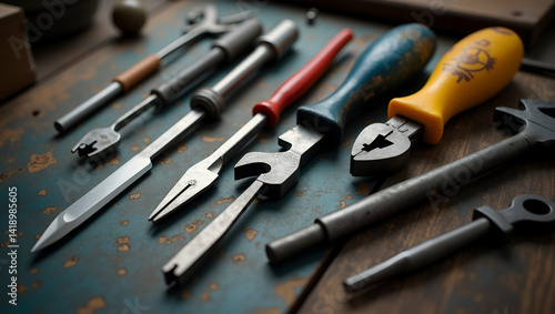 Comprehensive Array of Precision Hand Tools for Detailed Assembly and Artistic Crafting in a Professional Workspace - Photo Stock Concept with Empty Left Space
