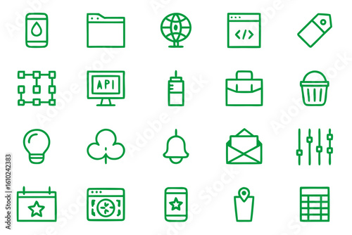 Comprehensive collection of clean modern line art symbols for technology and business modules presented in a versatile graphic format with key color elements