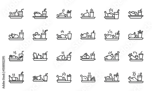 Comprehensive Collection of Outline Icons for Fast Food, Fried Chicken, Meals, and Condiments