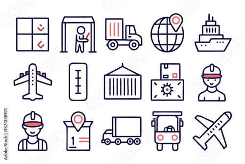 Comprehensive collection of simplified graphical elements representing various aspects of shipping logistics and cargo transportation services for modern business applications