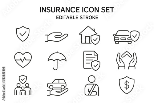Comprehensive Insurance Icon Set, Editable Stroke, Thin Line Vector Collection: Health, Life, Car, Home, Family, Document, Protection, Financial, Safety, Umbrella, Transparent Background