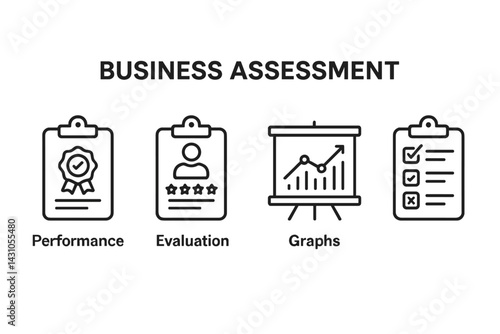 Comprehensive vector icon set for business assessment featuring performance, evaluation, graphs, and checklist designs