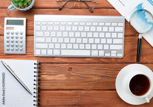 Computer and coffee on a wooden table. Business items on the table. Businessman desktop