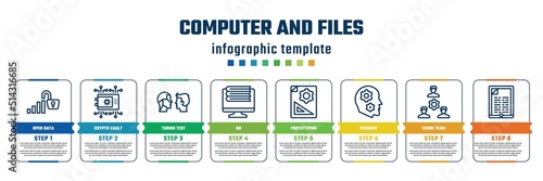 computer and files concept infographic design template. included open data, crypto vault, turing test, on, prototyping, thought, work team, icons and 8 steps or options.