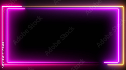 Computer generated color animation. 3D rendering neon frame of blue and pink colors on a black background