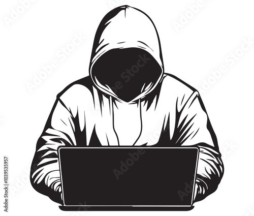 Computer hacker with laptop icon vector illustration silhouette. Hacker working on laptop. Hacker silhouette icon