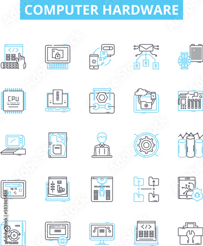 Computer hardware vector line icons set. Computer, Hardware, Monitor, Keyboard, Mouse, CPU, RAM illustration outline concept symbols and signs