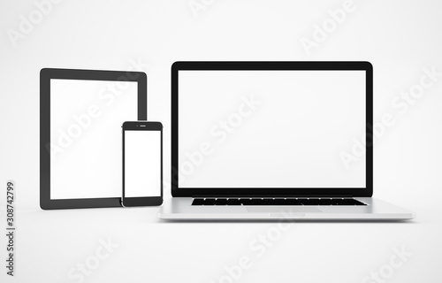 Computer, laptop, tablet, smartphone, display. on white background workspace mock up design illustration 3D rendering