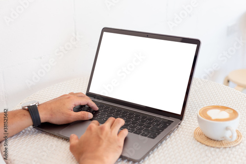 computer mockup blank screen.hand woman work using laptop with white background for advertising,contact business search information on desk at coffee shop.marketing and creative design
