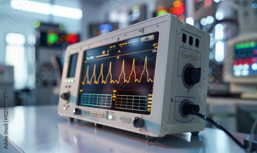 Computer monitor displays a graph of a heart rate. The monitor is connected to a device that is attached to a person's body. Concept of medical technology