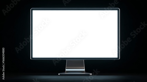 Computer monitor screen mockup in modern 3D rendering, floating against black backdrop, slim body design, blank bright display for content placement