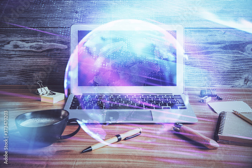 Computer on desktop in office with technology theme hologram. Double exposure. Tech concept.