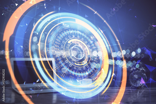Computer on desktop in office with technology theme hologram. Multi exposure. Tech concept.