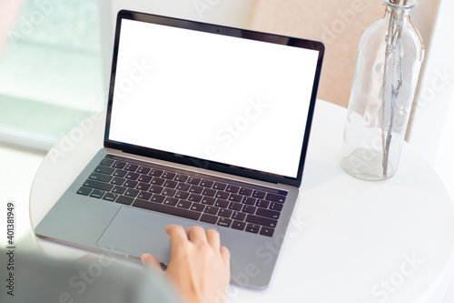 computer screen blank mockup.hand woman work using laptop with white background for advertising,contact business search information on desk at coffee shop.marketing and creative design