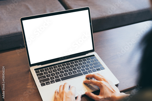 computer screen blank mockup.hand woman work using laptop with white background for advertising,contact business search information on desk at coffee shop.marketing and creative design