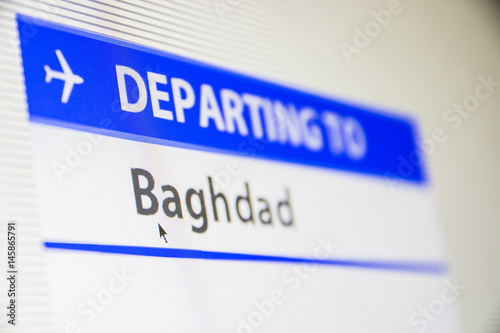 Computer screen close-up of status of flight departing to Baghdad, Iraq