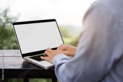 Computer screen, hand Male work using laptop.with white background for advertising, contact business search information on desk.