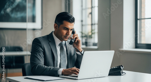 Concentrated businessman in a suit making a phone call while using his laptop in a modern office, depicting professional communication and multitasking.