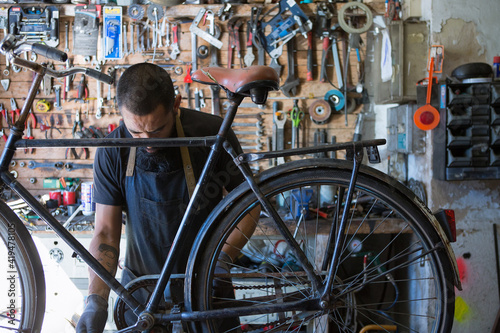 Concentrated male mechanic with beard and tattoos in gloves repairing bicycle in modern workshop