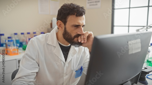 Concentrated middle-aged bearded man in lab coat working indoors at hospital computer.