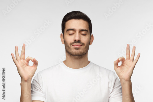 Concentrated relaxed man standing with closed eyes, having relaxation while meditating, trying to find balance and harmony. Yoga and meditation concept