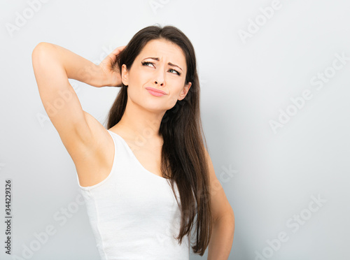 Concentrated young fitness woman in casual clothing with hand under the face find the solution. Corona virus. Training online at home. Studio portrait