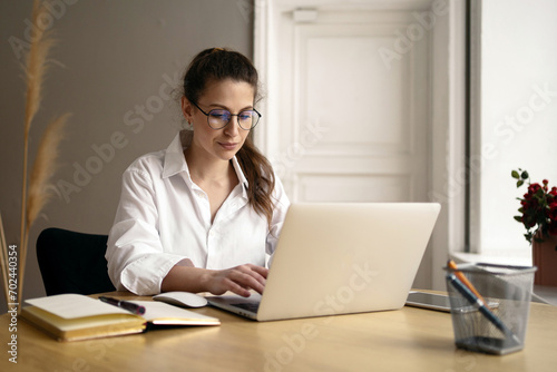 Concentrated young woman working on a laptop in a serene home office, displaying focus and professionalism