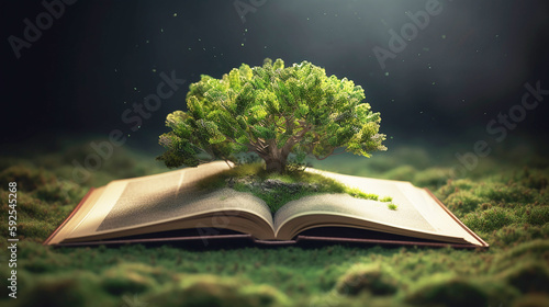 Concept : image with green tree growing from book, Book or tree of knowledge concept with tree growing from an old open book, Generative AI