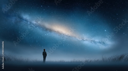 Concept art of an endless galaxy, a night sky filled with bright stars and nebulae, a person standing on the ground looking up at it