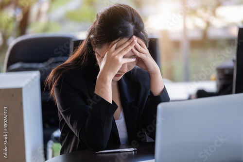 Concept Burnout Syndrome. Business Woman feels uncomfortable working. Which is caused by stress, accumulated from unsuccessful work And less resting body. Consult a specialist psychiatrist.