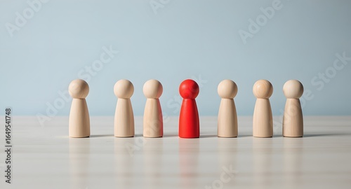 concept Business & HR for leadership and team leader, row of wooden dolls standing on wood table that one Different and stand out from the group