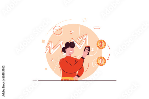 Concept Cryptocurrency investment with people scene in the flat cartoon design. A woman analyzes the growth of cryptocurrencies and thinks about where to invest funds. Vector illustration.