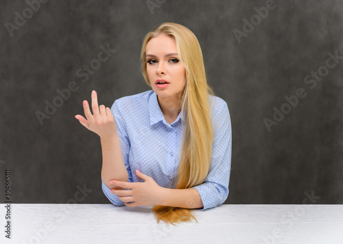 Concept cute model talking to the camera sitting at the table. Close-up Portrait of a beautiful blonde girl with excellent makeup with long smooth hair on a gray background in a blue shirt.