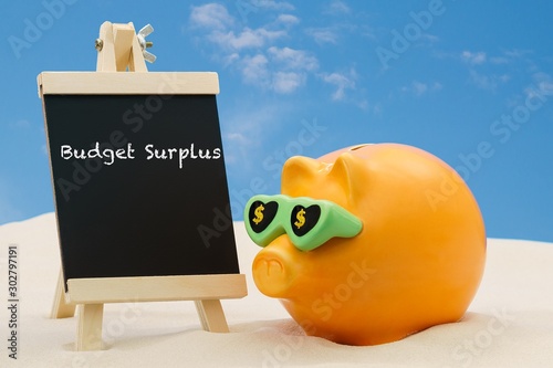 Concept image for saving and financial success featuring a bright orange coloured piggy bank with text written on a chalkboard. The setting is a mock beach scene with a blue sky background.