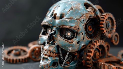 concept Lack of freedom with death dark AI robot that has been crushed by many rusty gears, Dynamic colors, copy space for text , realistic photo high detailed