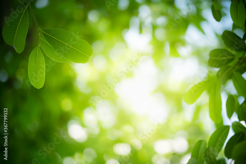 Concept nature view of green leaf on blurred greenery background in garden and sunlight with copy space using as background natural green plants landscape, ecology, fresh wallpaper concept.