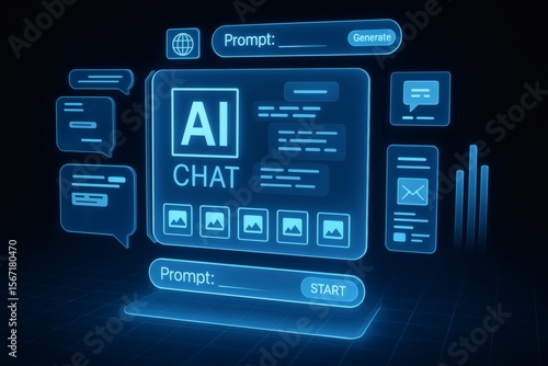 Concept of an Artificial Intelligence chatbot. Futuristic virtual interface for communication, customer service, and content generation with a glowing blue hologram.