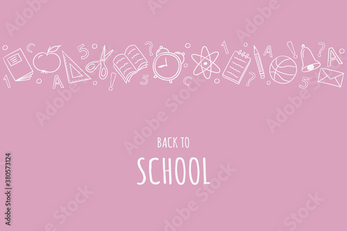 Concept of Back to School card. Background with hand drawn accessories. Vector