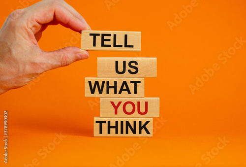 Concept of building success foundation. Men hand put wooden blocks on the stack of wooden blocks. Text 'tell us what you think'. Beautiful orange background, copy space.