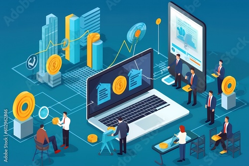 Concept of business growth and financial investment, featuring executives using laptop computers to analyze sales data and economic growth graphs. Created with generative A.I. technology.