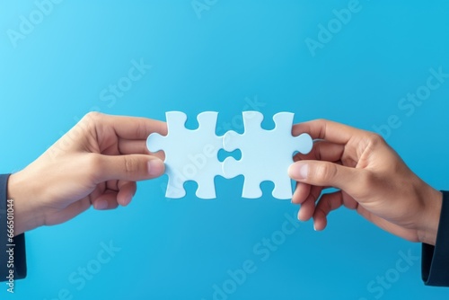 Concept of business,hands holding a jigsaw puzzle on pastel blue background, in blue colors, puzzles not converge